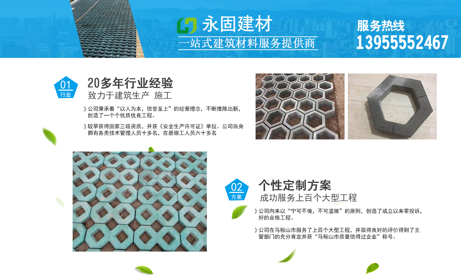 馬鞍山市永固建材有限公司,成立于一九九六年六月。公司秉承著“以人為本,信譽至上”的經(jīng)營理念,不斷推陳出新,創(chuàng)造了一個個優(yōu)良工程。較早獲得國家三級資質,并獲《安全生產(chǎn)許可證》單位。公司自身擁有各類技術管理人員十多名,在冊施工人員六十多名,公司向來以“寧可不做,不可濫做”的原則,創(chuàng)造了成立以來零投訴,好的合格工程。得到了主管部門的充分肯定并獲“馬鞍山市質量信得過企業(yè)”稱號。我們從戰(zhàn)略高度審視市場,創(chuàng)造性開展各項工作,在建筑裝飾行業(yè)中,力爭做到人無我有,人有我精,在保證硬件實施的同時,注重軟件環(huán)境的建設,按現(xiàn)代企業(yè)制度的要求,樹立誠信的企業(yè)理念,推進企業(yè)的管理向系統(tǒng)化、正規(guī)化、制度化邁進;為創(chuàng)造好的企業(yè)、優(yōu)異的效益、好的管理打下堅實的基礎。我們把企業(yè)的發(fā)展、回報客戶和社會當做首要務,我們追求優(yōu)良品質,將以至誠至美的團隊協(xié)作精神誠信服務,竭誠為廣大客戶提供完善的服務。